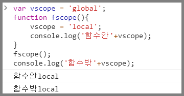 때문에 함수 fscope 내에서 vscope를 호출 했을 때 함수 밖에서 선언된 vscope의 값 global이 반환된 것입니다.