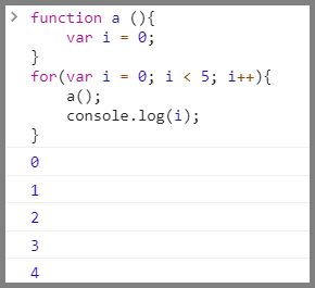 위의 예제에서 함수 a 안의 변수 i 는 지역변수이기 때문에, for 문에서 쓰이는 전역변수 i 에게