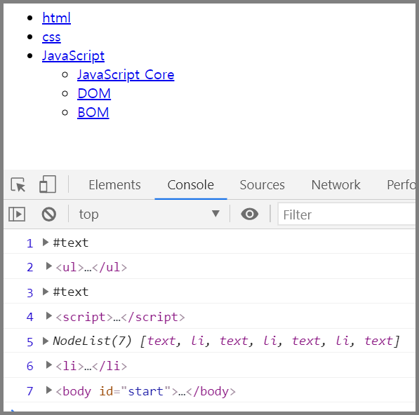 이것 또한 노드 취급하기 때문에, 바로 ul 태그가 출력되는 것이 아닌 text 가 출력되게 됩니다.