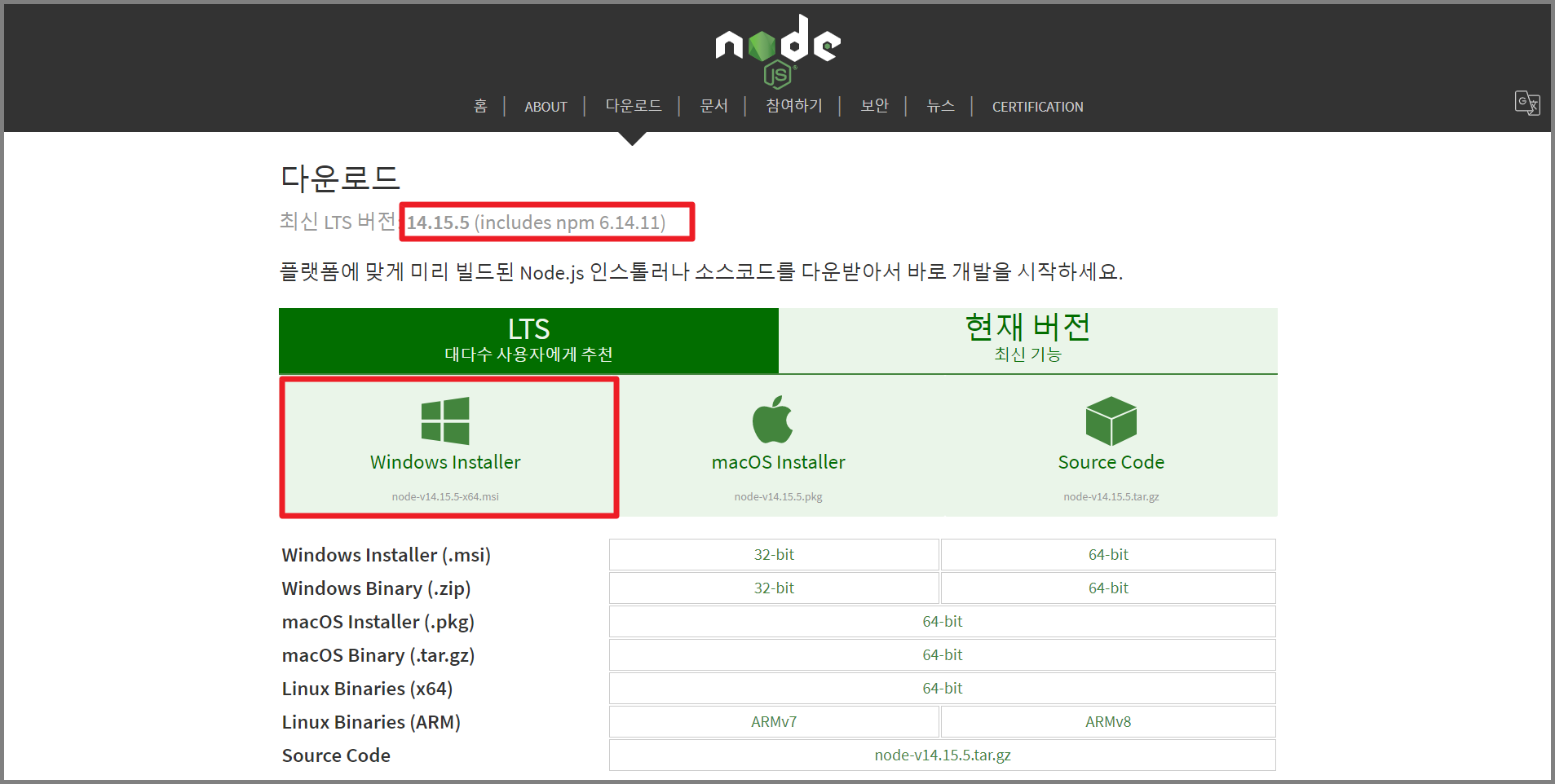 현재 가장 최신의 LTS 버전은 14.15.5 입니다.