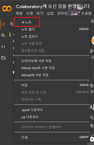 새로운 파일에서 하기 위해 왼쪽 상단에서 "새 노트"를 클릭하여 새로운 노트에 코드를 입력해보겠습니다.