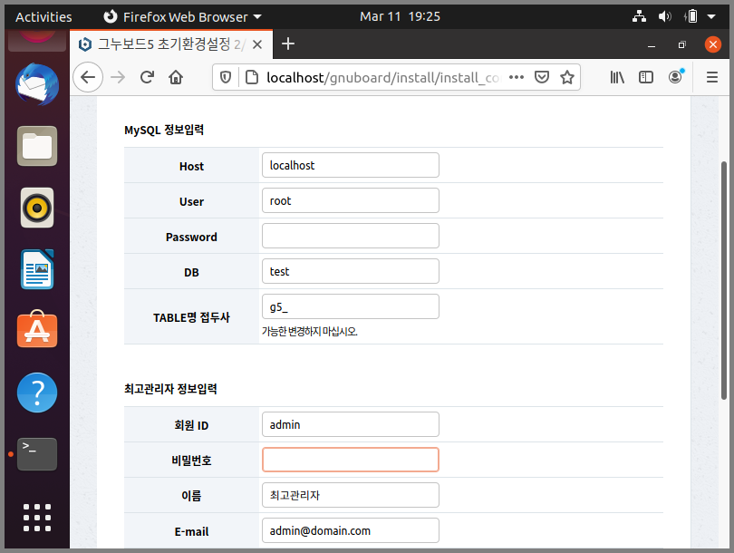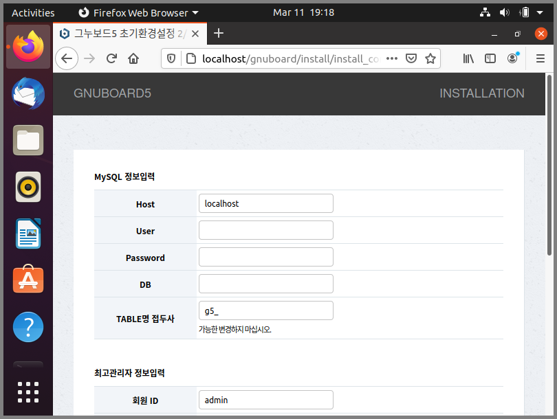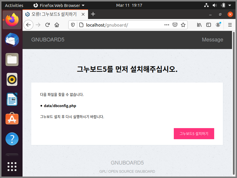 위 명령어를 실행시키고 localhost/gnuboard 를 브라우저에서 열면