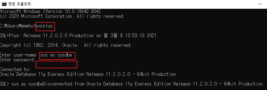 sqlplus 명령어를 입력한 뒤 sys as sysdba , 아까 설정한 패스워드를 입력하면 성공적으로 연결이 됩니다.
