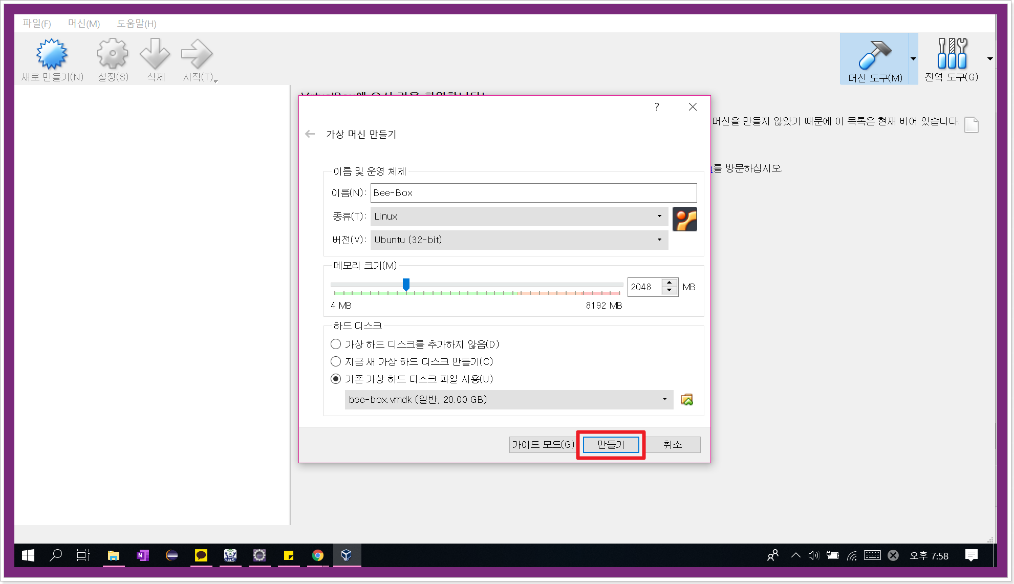 만들기를 클릭하여 비박스 가상머신을 만들어줍니다.