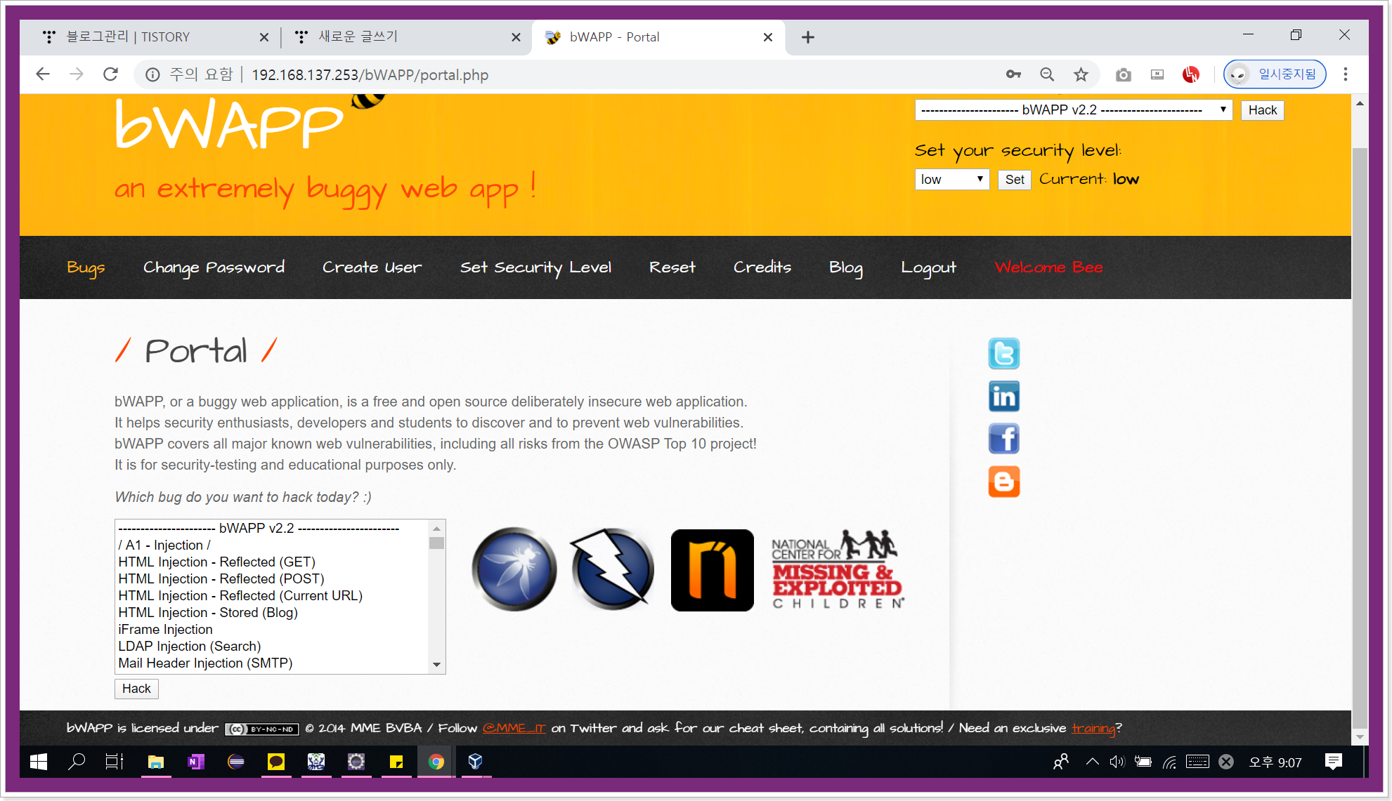첫번재 방법을 사용해서 bWAPP 페이지에 접속했습니다.