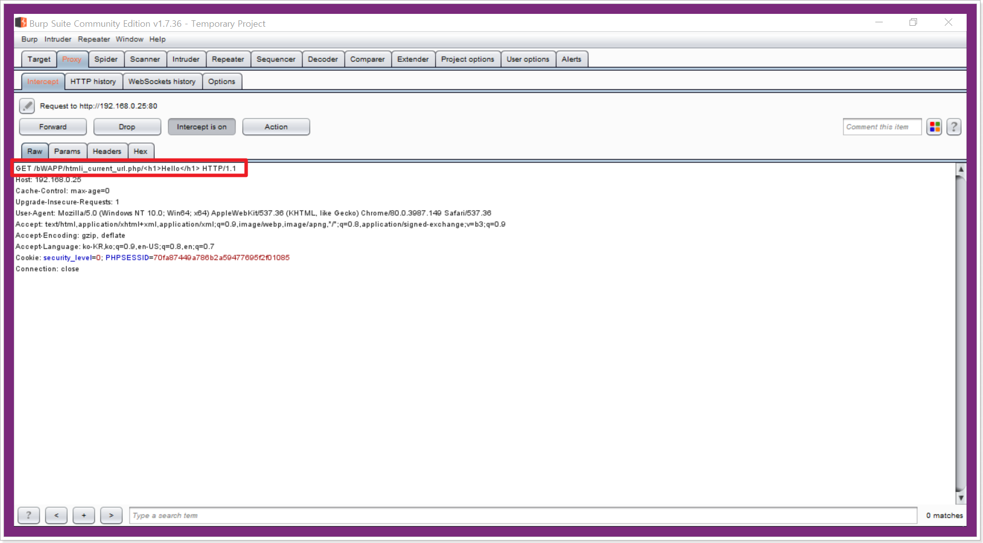 get 방식으로 Hostd와 /bWAPP/htmli_current_url.php 가 url 에 입력되어 나가는 것을 확인할 수 있었습니다.