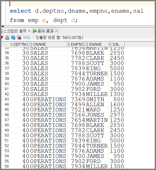 위의 쿼리문과 같이 모든 데이터들을 조인해서 보여주는 것이 교차조인입니다.