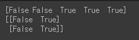 그 결과는 일반 연산과 마찬가지로 각각의 값에 대해 비교결과를 True 와 False 형태로 리턴한다.