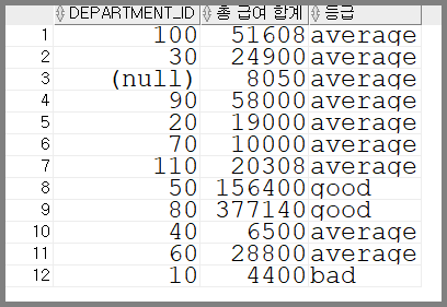 등급이 나오도록 부서번호(department_id), 총급여합계, 등급을 출력하라!