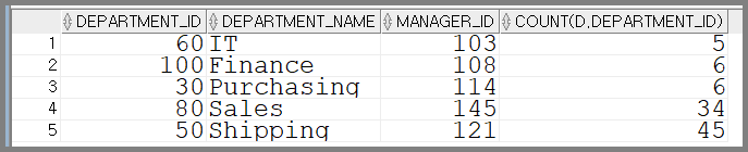 group by d.department_id,d.department_name,d.manager_id having count(d.department_id) >= 5