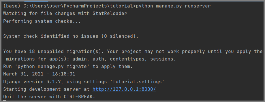 위 명령어를 입력하여 장고 프로젝트를 구동시켜 봅시다.