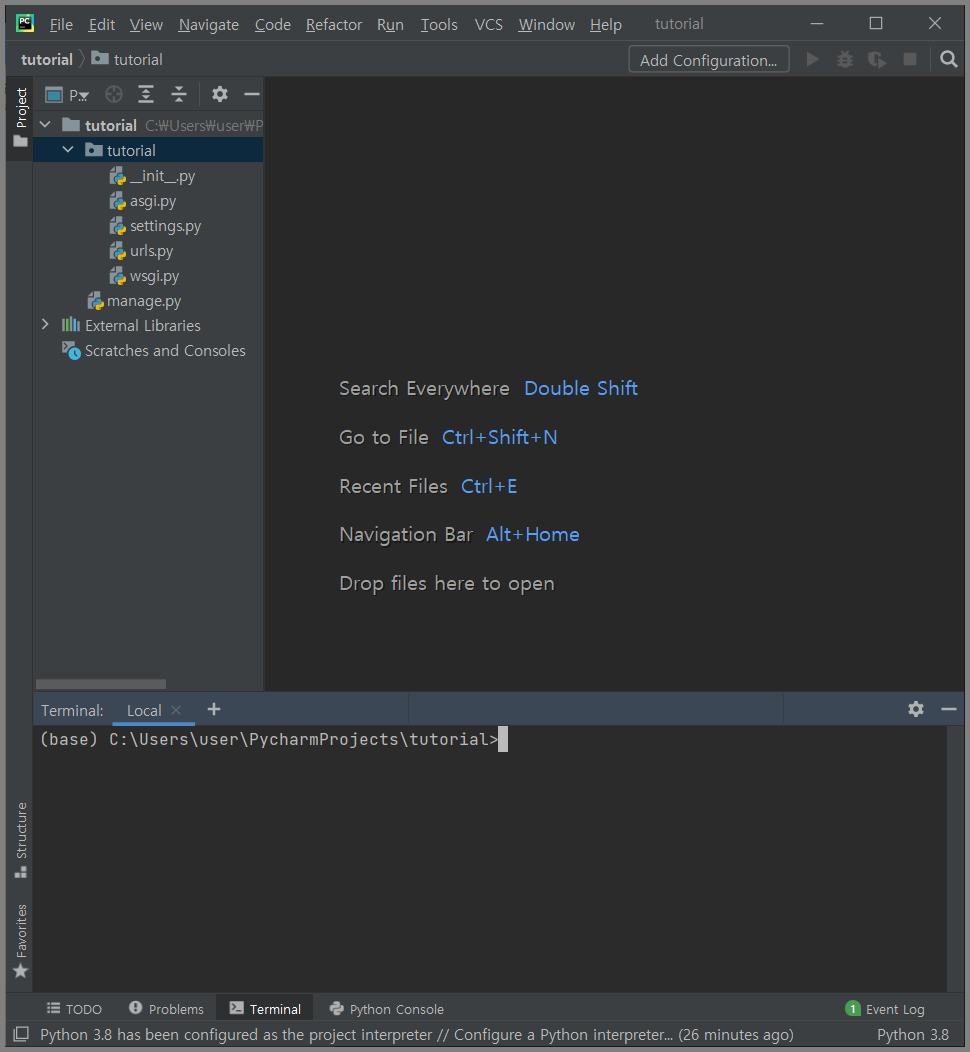 저는 tutorial 이라는 이름의 프로젝트를 생성했습니다.