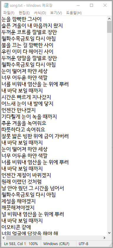 를 추가해 총 10곡의 가사를 메모장에 저장했다.