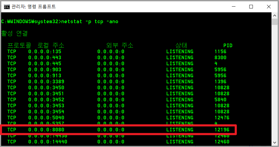 나의 경우 12196번이 8080 포트를 쓰고 있다!