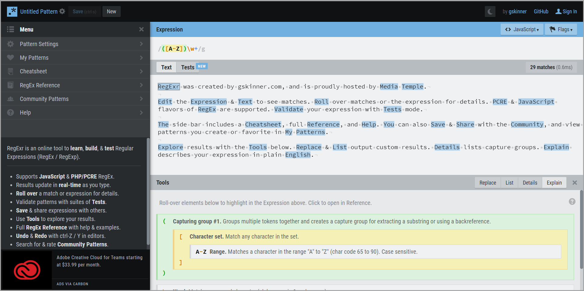 RegExr is an online tool to learn, build, & test Regular Expressions (RegEx / RegExp).
