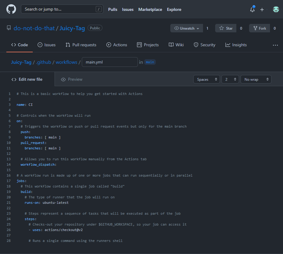 그럼 이렇게 main.yml 파일을 커밋할 수 있게 이미 만들어진 틀이 생긴다.