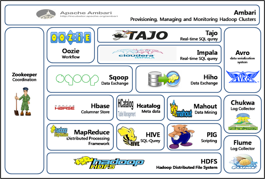 하둡 프레임워크 상에 존재하는 다양한 서브프로젝트들의 집합이라고 생각하면 된다.