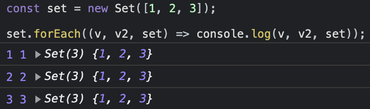 set.forEach((v, v2, set) => console.log(v, v2, set));