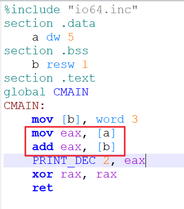 a 메모리 변수 안에 있는 값을 eax에 복사하고, eax 와 b 메모리변수의 값을 더합니다.