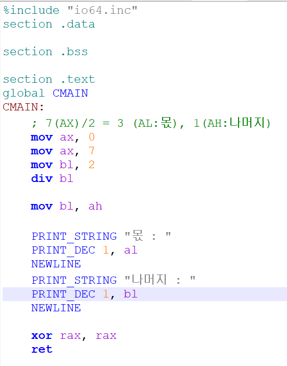 div 뒤에 붙는 파라미터 값은 AL을 나누는 수로, 몫은 AL에, 나머지는 AH에 저장됩니다.