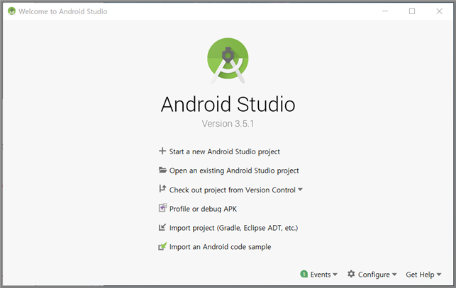 4. 설치를 완료하고 실행하면 안드로이드 스튜디오의 메인 화면이 나타나는 것을 확인할 수 있다.